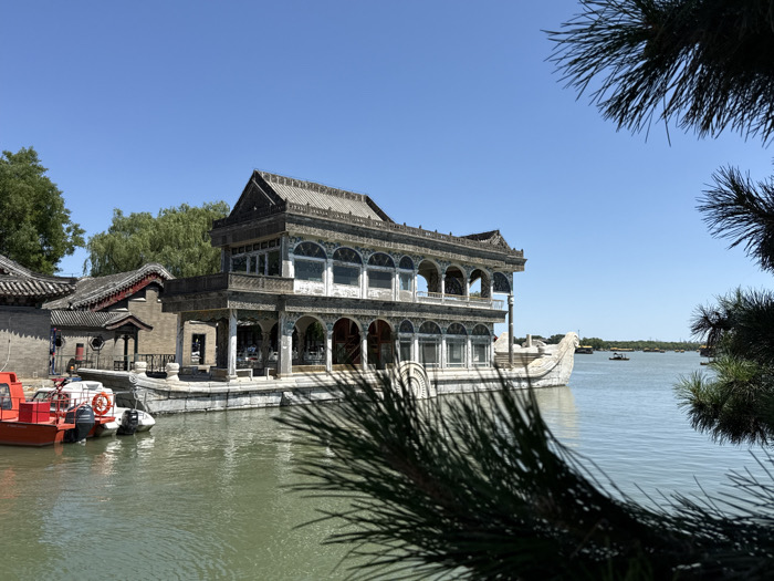The Marble Boat sits on a calm lake under a bright blue sky. The structure, adorned with ornate details, features two levels, arched windows, and a traditional Chinese roof. Nearby, a smaller building with a similar architectural style is connected by a bridge. A red and white boat is docked near the structure, while other boats are visible in the distance. A blurred pine branch partially obscures the view.