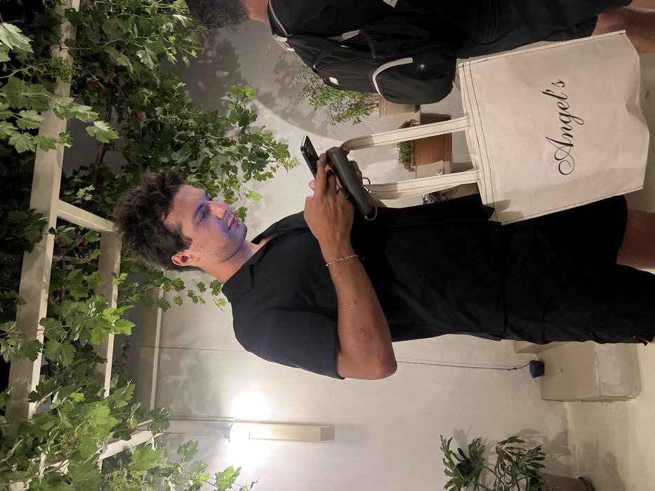 The image depicts two males in an outdoor, evening setting within Antiparos, Greece. The environment features white-painted walls, a vine-covered pergola with green grape clusters overhead, and potted green plants. The primary subject, a male with dark, textured hair, stands left of center, wearing a black short-sleeved collared shirt and black shorts. He holds a black smartphone in both hands, its illuminated screen casting a blue glow on his face as he looks downward. His left forearm displays several linear reddish marks. In his left hand, he also holds a black object with two metal rings and a large white tote bag inscribed with "Angel's" in black cursive font. To the right, a second male is partially visible from behind, wearing a black top and black shorts, and carrying a black backpack. A wall-mounted light fixture provides illumination from the left.