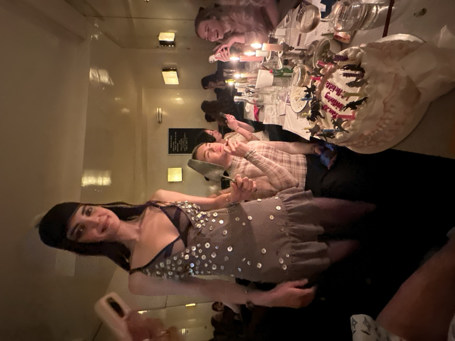 - "A woman in a silver dress with dark hair stands in front of a long table with lit candles, glassware, and a cake decorated with dinosaurs and a "Happy Birthday" message" by FM-3vHkT2, licensed under CC BY 4.0