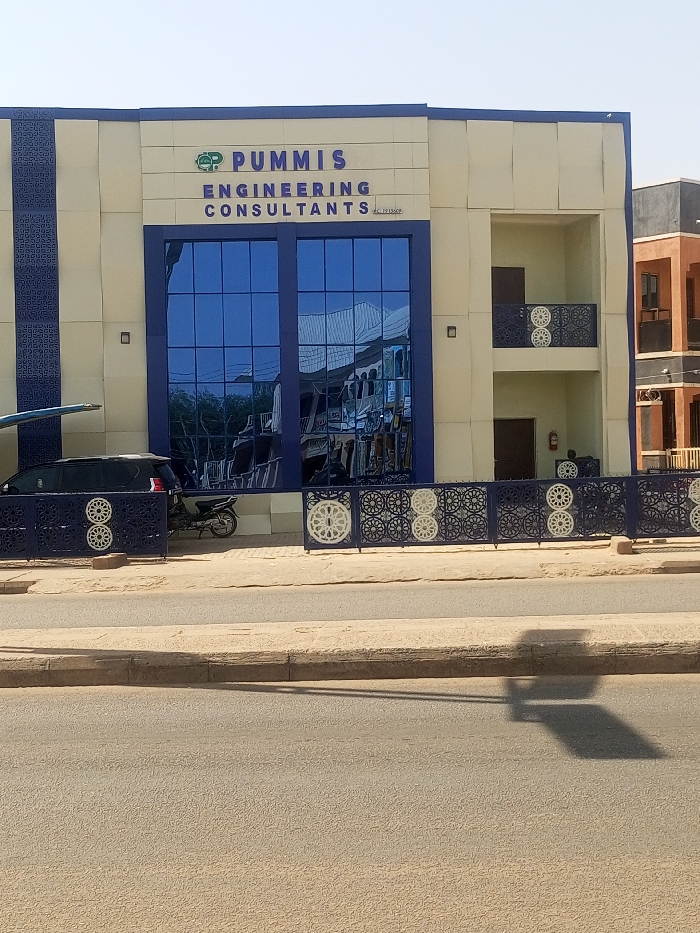 The scene depicts the exterior of a commercial building located in Pantame, Nigeria, under clear, sunny conditions. The primary structure features a light beige/cream facade with dark blue architectural accents. A prominent sign on the upper facade reads "PUMMIS ENGINEERING CONSULTANTS" in dark blue lettering, accompanied by a green "CP" logo and a smaller "RC 1915509" registration number. The ground and first floor levels are characterized by large, reflective blue-tinted windows, mirroring distorted images of the opposing street and foliage. To the right, two recessed sections, possibly balconies, are present on the first and second levels, each with a dark wooden door and a dark blue decorative railing featuring white circular motifs. A vertical dark blue patterned strip accents the building's left side. In the foreground, a paved road with a concrete curb and sidewalk runs horizontally across the image. A distinct, multi-component shadow from an unseen object is cast upon the road surface. Immediately behind the sidewalk, a dark blue metal fence with intricate white circular and geometric patterns delineates the building's property. Behind this fence, a dark-colored SUV or minivan is partially visible on the left, and a dark motorcycle is parked to its right. A portion of an adjacent building, exhibiting a brownish-orange facade with dark windows, is visible to the right of the primary structure. No individuals or direct actions are clearly discernible within the frame.