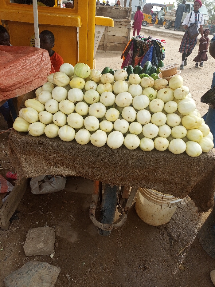- "A market scene in Gayawa, Nigeria, depicts a vendor's cart laden with approximately 150-200 pale green to off-white, spherical fruits, likely small melons or calabash gourds, meticulously stacked on a coarse brown fabric cover" by FM-OHoyj2, licensed under CC BY 4.0
