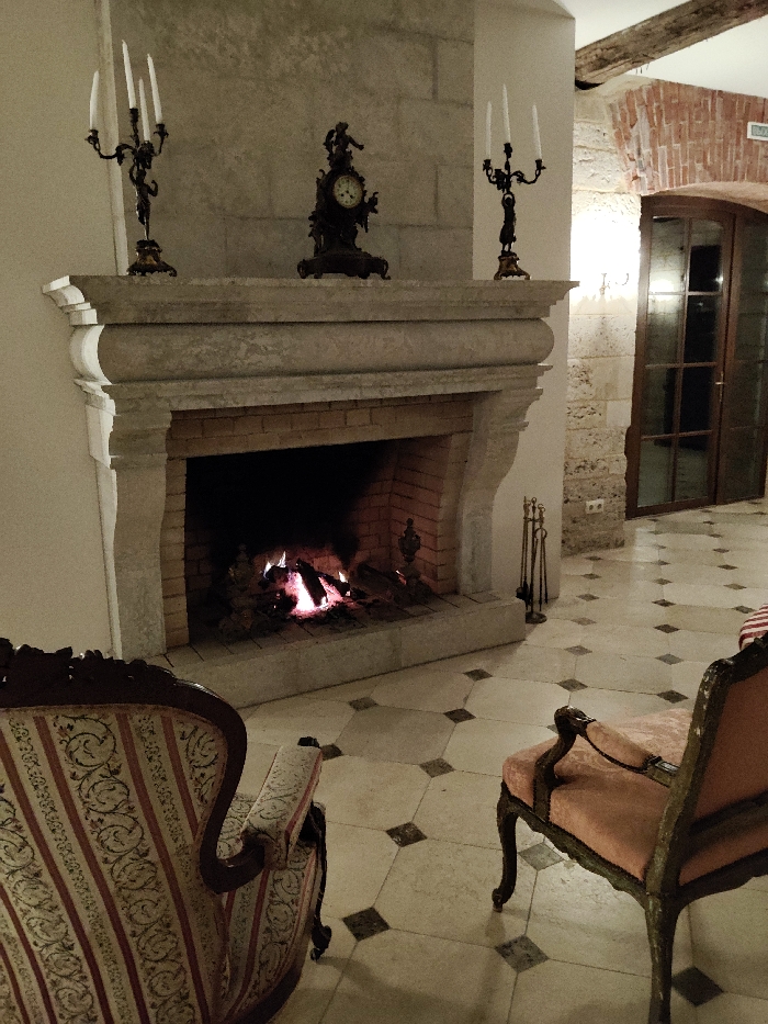 The scene depicts an interior room within a building located in Скорняково, Russia. The focal point is a large, light-grey stone fireplace with a fire actively burning inside its brick-lined hearth, exhibiting glowing embers and small flames. Positioned on the mantelpiece are three decorative items: a bronze mantel clock with a sculptural figure on its top sits centrally, flanked by two identical bronze candelabras, each holding three unlit white taper candles. To the immediate right of the fireplace, a brass-toned set of fireplace tools rests in a stand. The floor is a light-colored tile, featuring a repetitive pattern of smaller, darker square tiles set diagonally. In the foreground, two antique-style armchairs are positioned facing the fireplace. The armchair on the left is upholstered in a striped fabric with cream, red, and patterned sections, featuring dark, carved wooden armrests and legs. The armchair on the right is upholstered in a plain peach-colored fabric, also with dark, carved wooden elements, appearing somewhat worn. The room's walls consist of a plain light-colored section to the left of the fireplace and a textured section of light-colored, rough-cut stone blocks to the right. In the upper right background, a dark wooden double door with multiple glass panes is set within an arched red brick entryway. A wooden ceiling beam is visible above the doorway. The overall lighting is dim, primarily illuminated by the fire and ambient light sources, with no individuals present in the frame.