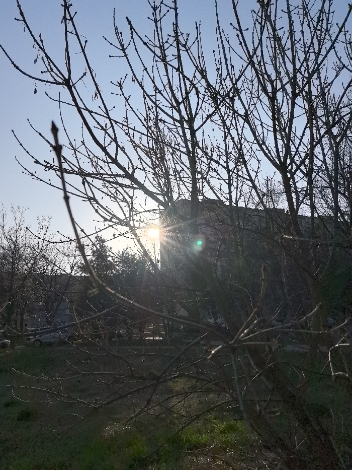 The image depicts a heavily backlit outdoor scene, likely a park or green space within an urban environment. The foreground is dominated by the silhouetted, bare branches of a deciduous tree, extending across the frame. Numerous smaller branches with visible buds point upwards, indicating a dormant season, such as late winter or early spring. The sun is positioned to the left of the frame, partially obscured by the tree, emitting a strong starburst lens flare and a distinct green circular lens artifact. This intense backlighting renders much of the midground and background in shadow. Behind the immediate trees, parts of a multi-story building with a flat roofline are visible, also silhouetted. Further trees and vegetation, dark and indistinct due to the lighting, separate the foreground from the building. The sky above is clear and light blue. The very bottom of the frame shows patches of green grass, suggesting ground cover beneath the trees. No individuals, vehicles, or specific identifying landmarks are discernible. Based on the provided context, the general location is the city of Sofia, Bulgaria, though a precise address or neighborhood cannot be determined from the visual evidence alone.