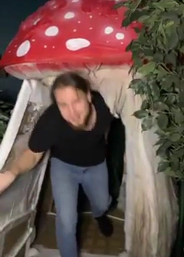 Here’s a concise description of the video: A man emerges from a mushroom-shaped structure
