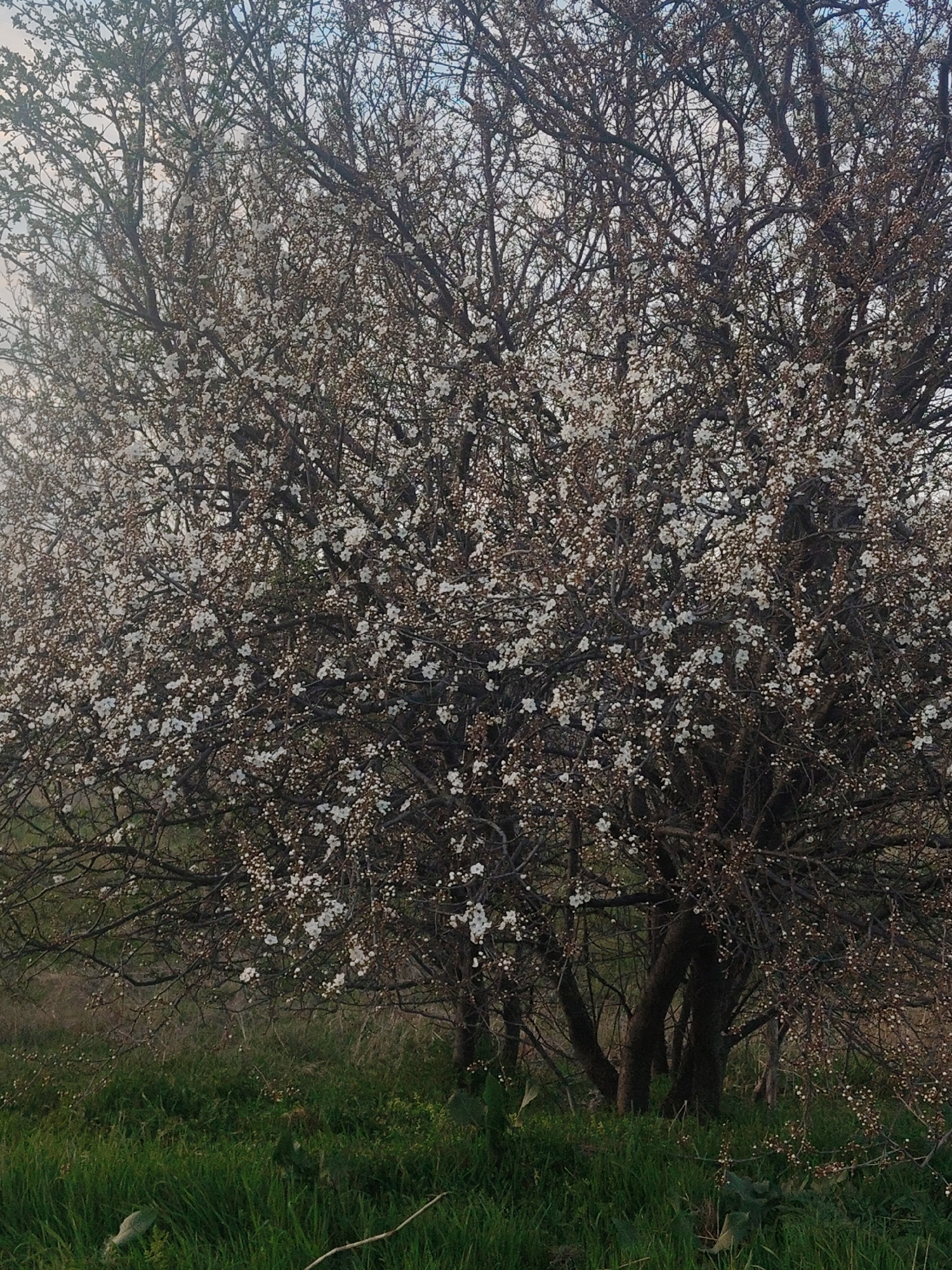 The image displays a large, deciduous tree, likely a Prunus species, in full early spring bloom within Sofia, Bulgaria. The tree occupies the majority of the frame, characterized by a dense network of dark, gnarled branches heavily covered with numerous small white flowers and unopened white flower buds. The branches are largely devoid of green foliage. The ground directly beneath the tree consists of unkempt, vibrant green grass interspersed with some dry vegetation. The upper tree canopy is set against a bright, overcast sky, showing faint patches of pale blue and white. No human figures, animals, or artificial structures are present in the scene.