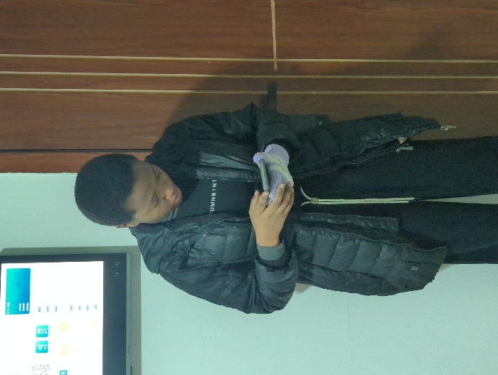 A person wearing a dark puffer jacket and black pants is seen holding a phone with a gloved hand. They are indoors, standing against a light-colored wall. A monitor displaying various icons is positioned to the person's left. Above, the background features a wooden surface with horizontal lines. The overall lighting appears somewhat dim.
