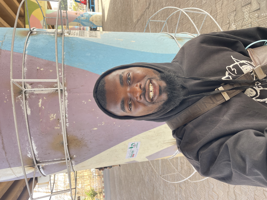 A dark-skinned adult male, with a beard and a visible diastema between his upper front teeth, smiles directly into the camera in a close-up selfie. He is wearing a black hooded sweatshirt and a brown cross-body bag. The background features a large, cylindrical concrete pillar, painted with faded geometric sections of purple, light yellow, and light blue. Two circular rebar frameworks are attached to the pillar. A partially legible green and white sign, displaying 'RALLY FOR' and 'NIGERIA,' is affixed to the pillar. The scene is an outdoor public space under an overhead bridge or flyover in Jos, Nigeria, with paved ground and additional distant structures and individuals visible.