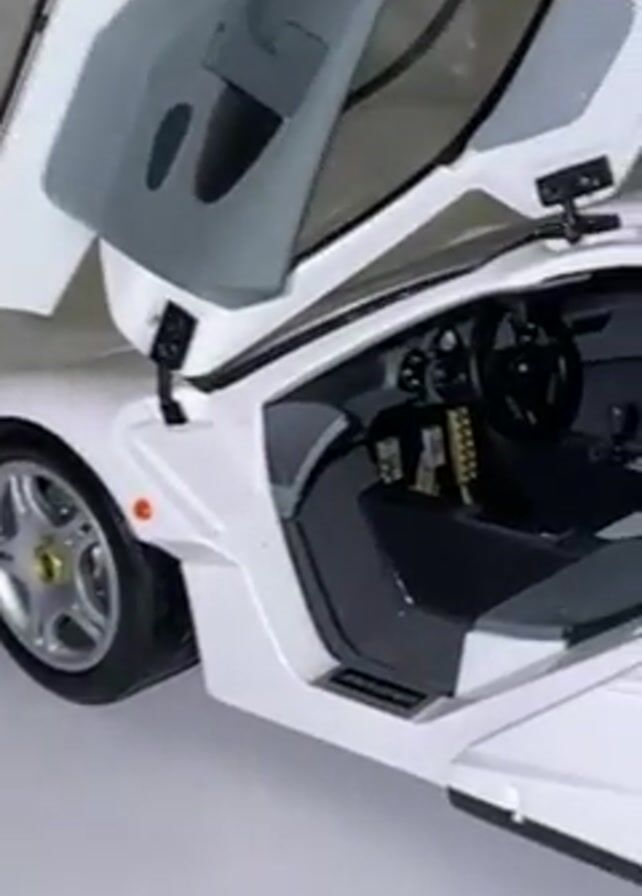 close-up view of a white McLaren F1 model car. One of the gullwing doors is open, revealing the detailed interior with a black steering wheel and gold pedals. The car sits on a white surface.