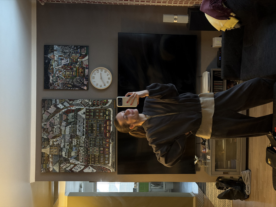 A woman is taking a selfie in a living room. She's wearing a dark gray sweatsuit with a light-colored waistband. Behind her is a large television, flanked by two framed pieces of art. One depicts a winter scene, and the other depicts a European-style city. A simple clock hangs between the two pieces of art. Various furniture and decorative items are visible in the periphery.