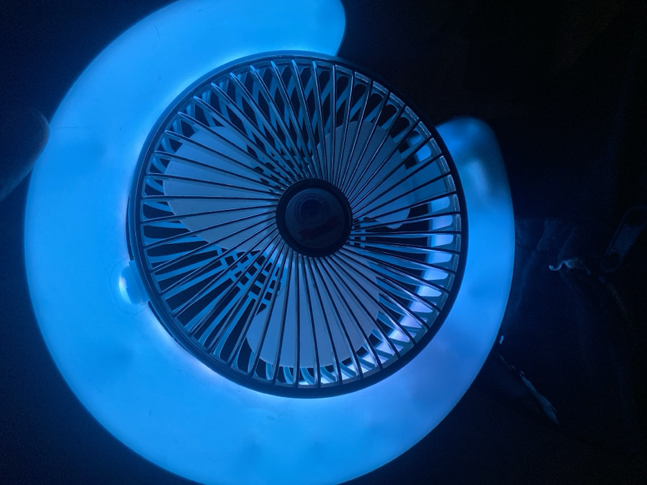 A circular fan with a black frame and white blades is centrally positioned. The fan is encased within a luminous, semi-circular object that glows with a vibrant blue light. The background is dark, emphasizing the fan and the bright blue illumination surrounding it. The device creates an unusual visual effect, combining the function of a fan with the aesthetic of a soft, colorful light source.