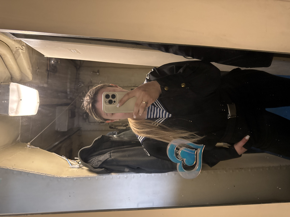 A female individual is depicted from the chest up, captured in a mirror selfie within what appears to be a ship's interior