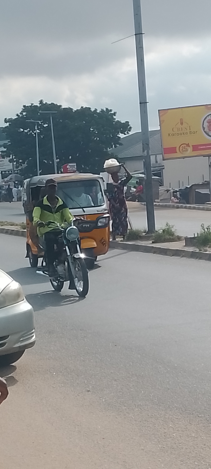 The image depicts an urban street scene in Lokoja, Nigeria, likely during daytime under an overcast sky. In the immediate foreground, the front bumper and lower portion of a light-colored sedan are visible on the left. The mid-ground features vehicular and pedestrian traffic. A male individual, wearing a light green and black long-sleeved jacket and a dark baseball cap, operates a dark-colored motorcycle moving left to right. Immediately behind the motorcycle, an orange and white TVS-brand Bajaj RE (Keke Napep) tricycle is in motion, also moving left to right. At least two occupants are visible inside the tricycle's cabin. To the right of the tricycle, a female pedestrian, dressed in a patterned full-length garment, walks along the edge of the road, carrying a light-colored, possibly white, woven basket or container balanced on her head. She is positioned near a tall, light-colored utility pole. In the background, on the right side of the frame, a prominent yellow rectangular sign for "CREST Karaoke Bar" with additional text and imagery is visible above a low-rise building. Further back, indistinct buildings and green trees line the street. The road surface is asphalt, and a concrete curb separates it from a patch of unkempt vegetation. Multiple utility poles and wires are present throughout the scene.