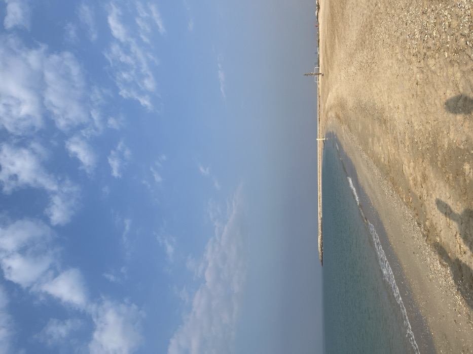 The image displays an outdoor coastal scene under a clear blue sky with scattered white cumulus clouds. The sky occupies approximately the upper two-thirds of the frame, transitioning to a lighter, hazy blue towards the horizon. The left portion of the lower third depicts calm, turquoise-colored seawater with gentle waves breaking onto a sandy shore. A man-made breakwater, composed of large rocks, extends from the left mid-ground towards the center-right, separating the tranquil bay from the open water. The foreground and right portion of the lower third consist of a wide, light brown sandy beach, littered with small shells and pebbles near the waterline. Two elongated, indistinct human shadows are cast onto the sand in the immediate foreground, pointing away from the camera. A light-colored, vertical cylindrical marker is positioned on the sand where the beach meets the breakwater. Further along the beach to the right, a white, rectangular metal frame, possibly a small goalpost, is visible. In the distant background, faint structures or buildings are discernible along the coastline. The scene is located in the city of Unknown, United Arab Emirates.