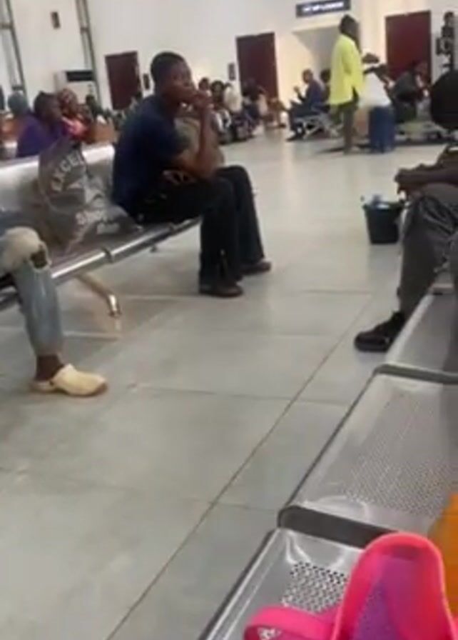 waiting area at what appears to be an airport or train station. People are seated on metal benches, some looking at their phones. There is a "DEPARTURE" sign visible. Some people have luggage with them. The floor is tiled.