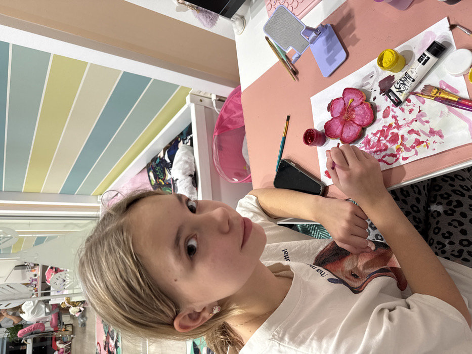 This image captures an indoor scene within a private room in Krasnoyarsk, Russia. A female, approximately 10-14 years of age, with light brown hair and wearing a white graphic t-shirt with a distorted animal face design and patterned leggings, is seated at a pink desk. She maintains a direct gaze towards the viewer. Her right hand holds a small paintbrush, actively applying red paint to a vibrant fuchsia-colored, flower-shaped object resting on a paint-splattered white sheet of paper. On the desk, adjacent to the artwork, are an open jar of red paint, an open jar of yellow paint, a black and white tube labeled "AK 16 Acrylic," and several paintbrushes. A black smartphone is positioned face down to her left. To her right, a light purple foldable device stand is empty, and a segment of a white computer monitor with a pink keyboard is visible. Small, light-colored earrings are present in her left ear. The background reveals a white bed frame with a multi-patterned duvet (featuring blues, greens, black, and pink) positioned behind the desk. The wall behind the bed displays diagonal stripes in alternating shades of light blue, light green, light yellow, and white. To the far left, a white wardrobe or shelving unit with decorative cut-outs (resembling leaves) is partially visible, reflecting the torso of an individual (possibly an adult) in a white top, a pink chair, and other room furnishings.