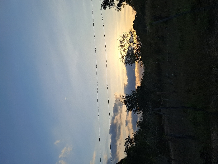 A rural landscape at dusk. Silhouetted trees and vegetation stand against a sky painted with hues of gold and blue. Wispy clouds streak the horizon, partially obscuring the setting sun. Faint lines, possibly power lines, run across the sky. The scene evokes a sense of peaceful solitude.