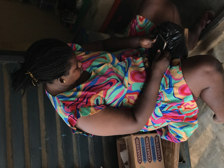 A woman sits with her legs slightly apart, wearing a colorful patterned dress with buttons. She holds a black plastic bag and a smartphone in her hands, focused on the screen. Her hair is styled in braids, pulled back in a low ponytail secured with a gold clip. She wears small gold earrings. A cardboard box labeled "COASTERS" rests near her leg. The background suggests an indoor setting, with striped flooring and various items.