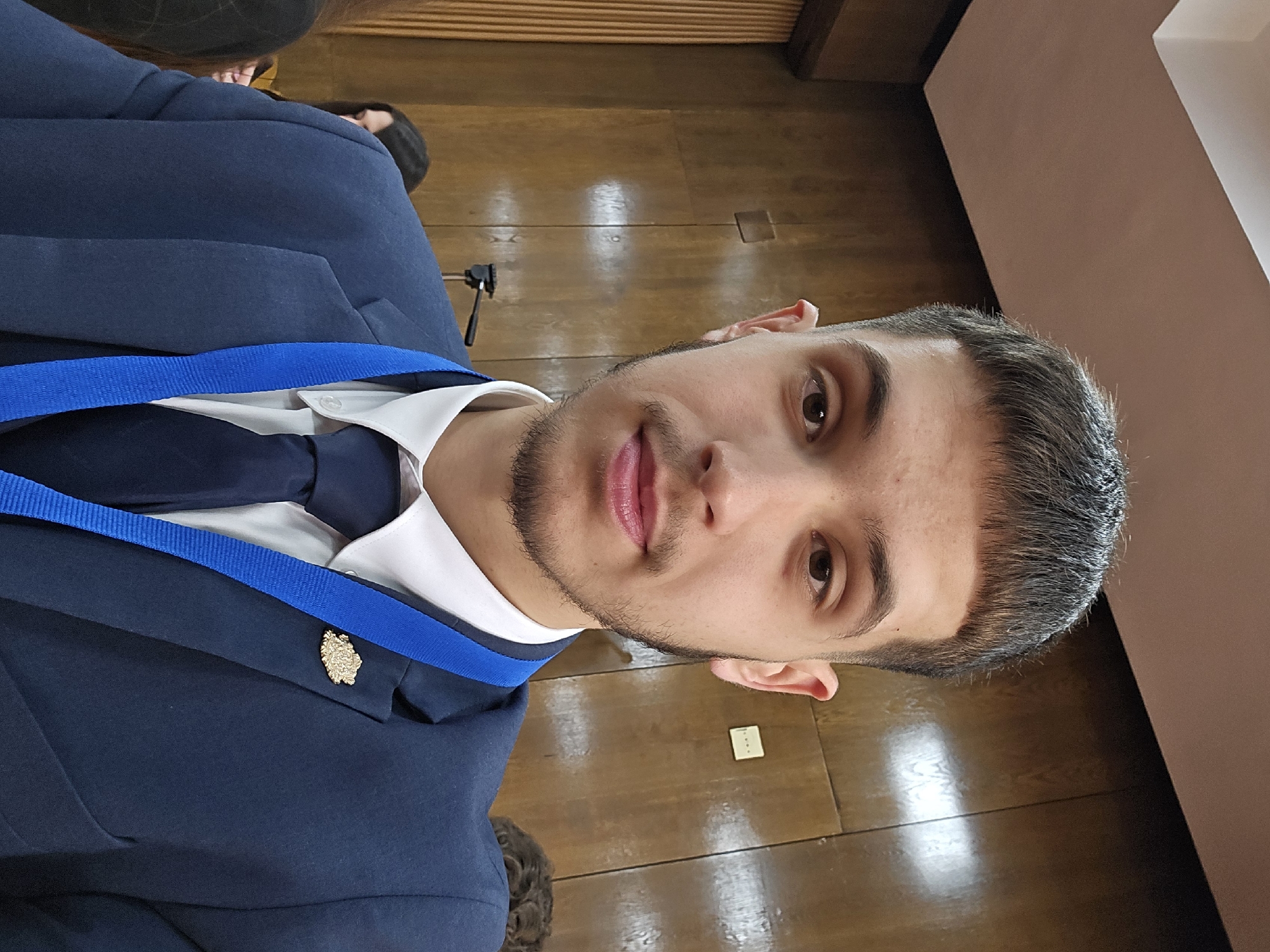 A young male, appearing to be in his late teens or early twenties, is depicted in a close-up, chest-up portrait. He has short, dark brown hair with a straight fringe, brown eyes, and a neat beard and mustache. He wears a dark blue suit jacket, a white collared shirt, and a dark blue tie. A bright blue lanyard is visible around his neck, resting over his shirt and tie. A gold-colored, circular lapel pin, bearing an intricate crest design, is affixed to his left lapel. His expression is neutral, with a slight parting of the lips. The background indicates an indoor, formal setting. The walls are paneled with polished, vertically-grained dark wood, displaying reflections of overhead lighting. A lighter-toned ceiling is visible at the top of the frame. To the left and right, portions of other individuals (primarily their hair) are visible, suggesting the presence of an audience or attendees. A dark tripod stand is partially visible behind the subject's left shoulder. A small, light-colored rectangular fixture is present on the wooden wall behind the subject's right shoulder. The environment suggests an auditorium, conference room, or similar institutional hall. This formal interior setting is consistent with a public building, such as a university (e.g., University of Ruse "Angel Kanchev") or municipal facility, located in Ruse, Bulgaria.