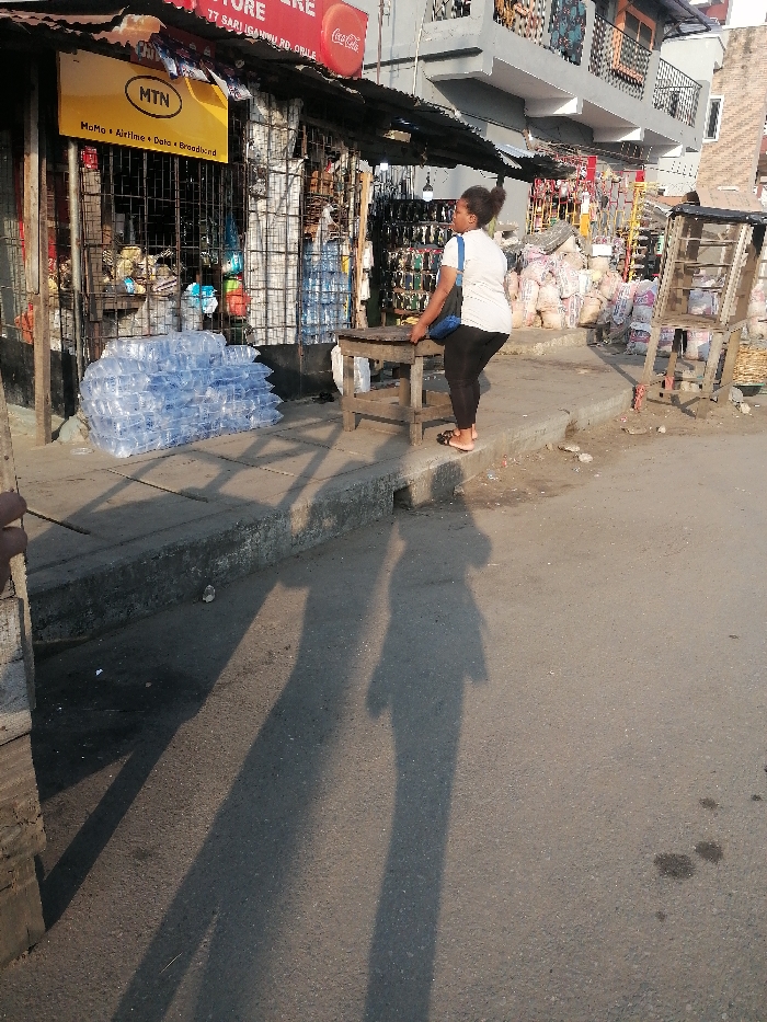 A woman stands on a stool outside a storefront. She wears a white top and dark leggings. The store is identified by an MTN sign and a Coca-Cola logo. Wrapped water bottles are stacked near the front. Shadows of two people are cast on the paved street. Other merchandise is visible in the background.
