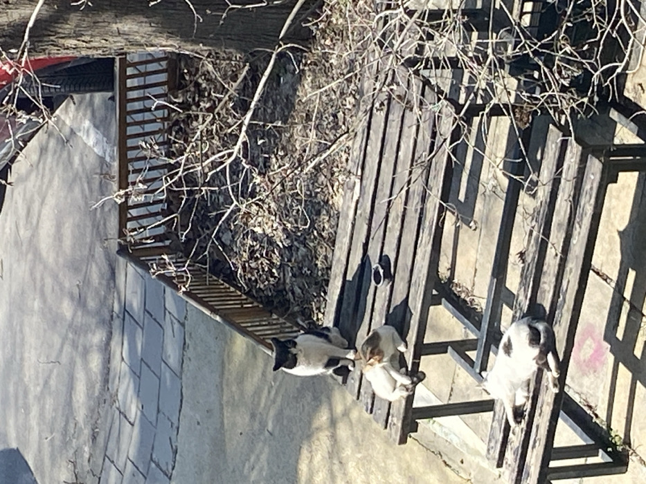 - "The scene depicts three domestic cats resting on and around a weathered wooden picnic table structure in an outdoor setting in Varna, Bulgaria, under bright sunlight" by FM-uDJxI2, licensed under CC BY 4.0