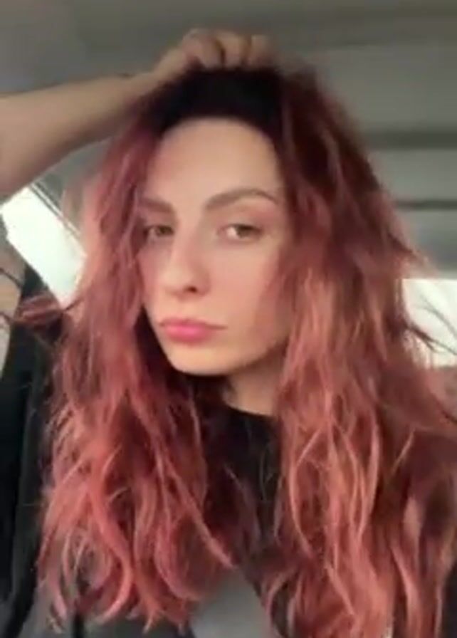A woman with medium-length, wavy, rose-colored hair sits inside a car. She is wearing a black shirt and a seatbelt. Her hair is messy, and she runs her fingers through it, styling it as she looks into the camera. The car's interior is visible in the background. There is music playing in the background.