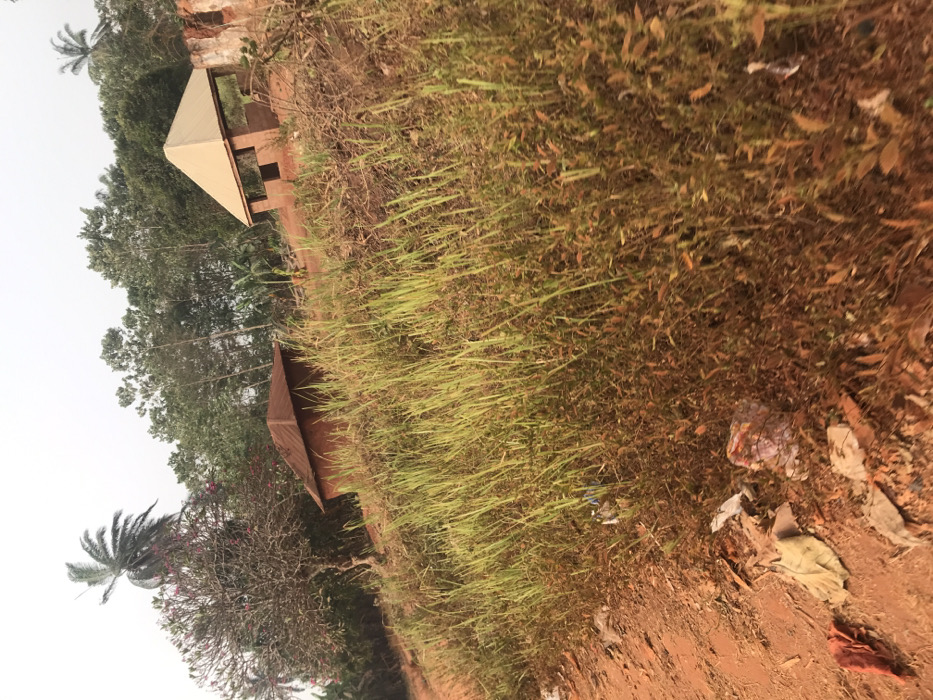 This image depicts a rural or semi-rural scene in Ogodo, Nigeria, under a hazy daytime sky