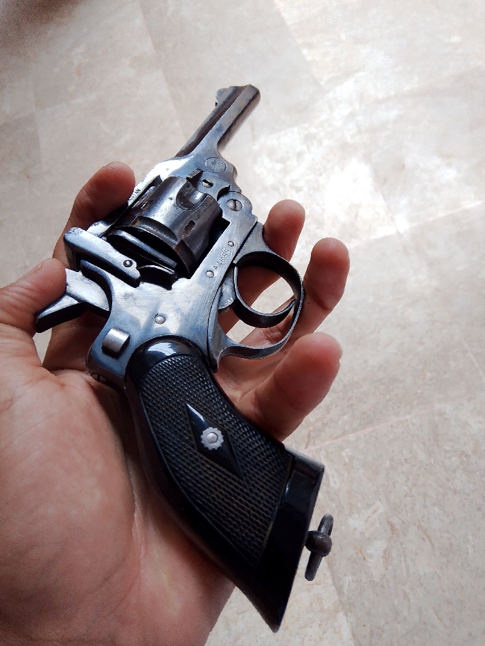 A high-angle, close-up photograph displays an adult's right hand holding a metallic revolver. The precise location in Mansehra, Pakistan, is not discernible from the background, which consists of a light-colored tiled surface with subtle patterns and visible grout lines, suggesting an indoor floor or patio. The revolver, appearing to be an older model with a blued or polished steel finish, is held with its barrel oriented upwards and to the left. The firearm exhibits a visible cylinder with chambers, a trigger, a trigger guard, and a hammer. Black, checkered grip panels with a central, light-colored decorative inlay are present on the handle. The serial number "A 48653" is clearly visible on the left side of the revolver's frame, above the trigger guard. A pin or attachment point protrudes from the base of the grip. The hand firmly grasps the revolver, with fingers wrapped around the grip and the thumb visible on the opposite side. The cylinder appears to be partially open or in a manipulated state, suggesting inspection or preparation. No other individuals or subjects are present in the immediate scene.