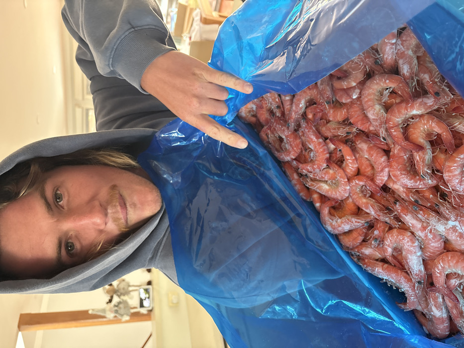 A person in a grey hooded sweatshirt is holding a large, blue plastic bag filled with a significant amount of raw shrimp