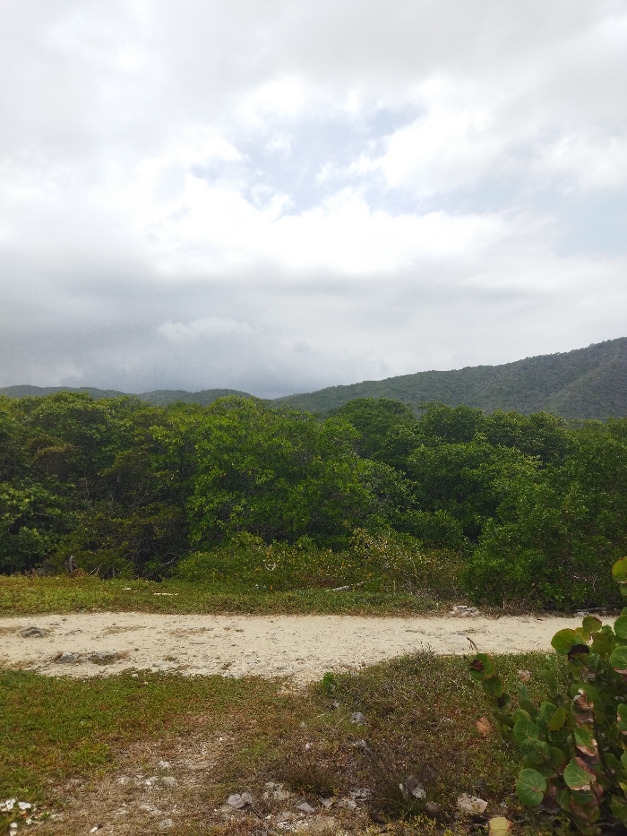 landscape under a cloudy sky. In the middle ground, a dense forest of green trees covers the land. A dirt path runs horizontally across the lower portion of the frame, with grass and shrubs on either side. In the background, a mountain range is visible behind the forest. The sky is overcast with grey clouds.