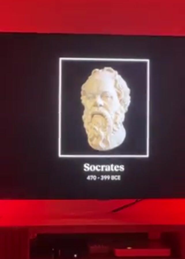 A television is visible, sitting atop a wooden shelf. The screen shows a bust of the philosopher Socrates. Below the bust is text identifying him, and the time period he lived in, 470 to 399 BCE. The room is illuminated by red light.