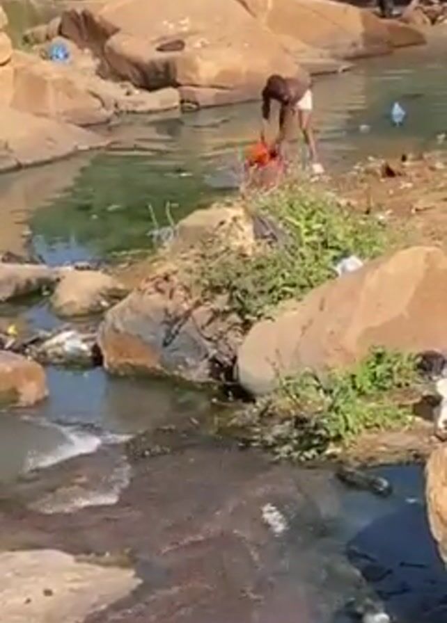 The video depicts a stream with trash strewn along its rocky banks. A person is standing in the water near the edge, holding an orange container. Another person is further upstream. The water is flowing over rocks and debris. Beyond the stream, there are trees, buildings, and a clear blue sky.