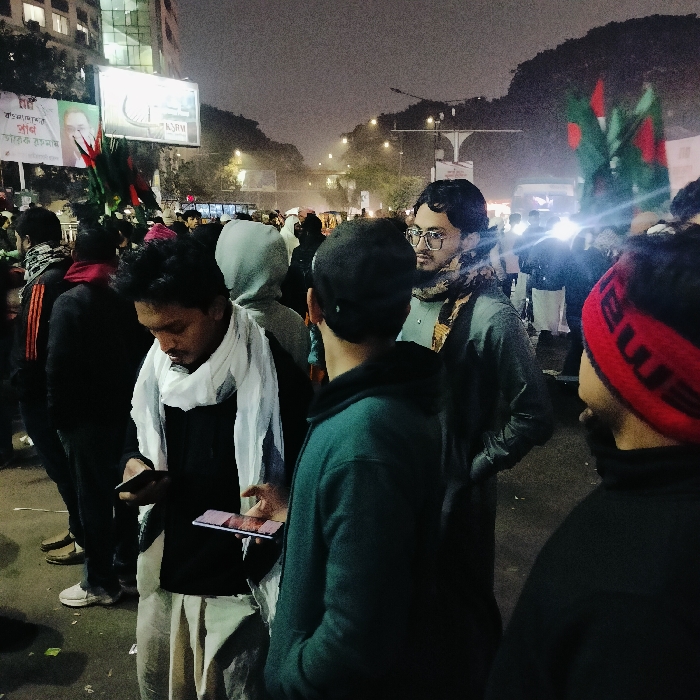 - "An urban street scene at night in Dhaka, Bangladesh, depicts a dense crowd of predominantly young men gathered, indicative of a public event or political rally" by FM-rkNqI2, licensed under CC BY 4.0