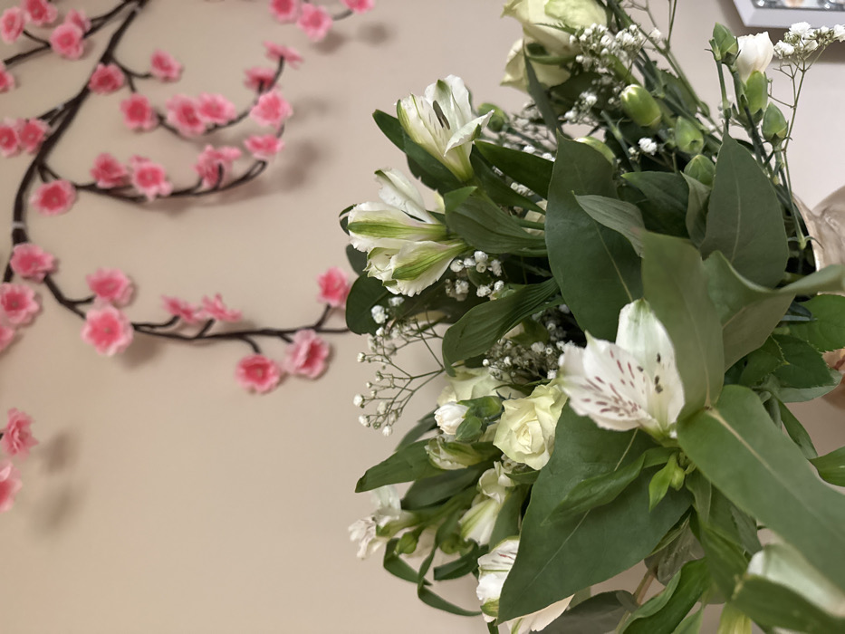 The image displays a close-up of a floral arrangement situated indoors in Tunbridge Wells, United Kingdom. The bouquet features a mix of white alstroemeria flowers, some exhibiting green central striations and others with small reddish-brown speckles, alongside creamy-white rose-like blooms and delicate white baby's breath (Gypsophila). Numerous large, green eucalyptus leaves are interspersed throughout the arrangement. The base of a light-colored, possibly gold-toned, vase or container is partially visible at the bottom of the frame, holding the flowers. The background is a plain, light beige wall. Mounted on this wall, predominantly in the upper half of the image, is a decorative element consisting of dark, intricate branches adorned with numerous small, bright pink artificial flowers, resembling a cherry blossom branch. No individuals are present, and no specific actions or interactions are depicted.