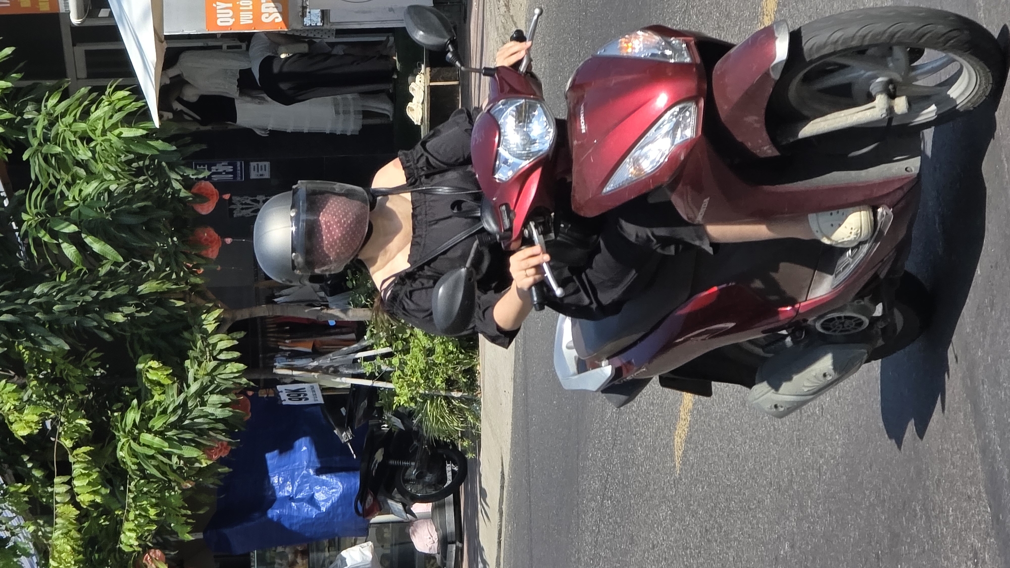 A medium shot depicts a woman on a red moped on a paved street in a city within Unknown, Vietnam. The woman is wearing a black shirt and a grey helmet with a clear visor. She has her hands on the handlebars. The moped is partially obscured. Behind the woman and the moped are trees, buildings, and other parked vehicles. A shop with clothing on display is visible on the left side.