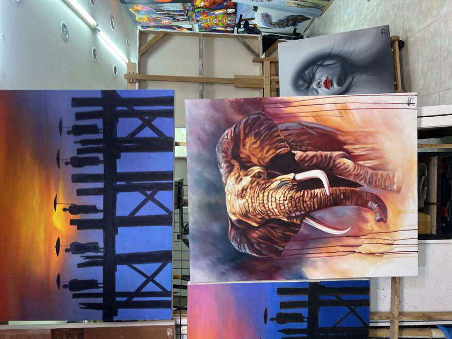 The image depicts the interior of an art gallery or studio located in Baan Chaweng, Thailand. The scene features multiple paintings displayed against white walls and light-colored tiled flooring. The white ceiling is illuminated by several overhead fluorescent tube lights and circular recessed lights. The primary focus is on several artworks. At the top, a large landscape painting shows six dark, silhouetted figures, each holding an umbrella-like object, walking left-to-right across a dark wooden pier or bridge. The sky above is rendered in a vibrant gradient of orange, yellow, and red, indicative of a sunset, contrasting with the deep blue water beneath the structure. Below this, centrally positioned, is a large, detailed oil painting of an African elephant facing forward. The elephant is depicted with brown and orange hues on its skin, prominent white tusks, and large ears. The background of this painting features abstract blends of red, orange, and purple, with vertical reddish paint drips visible on the lower left. To the immediate right of the elephant painting, a grayscale portrait of a woman's face is displayed, showing her eyes closed and her lips painted a vivid red. Her hair appears to be styled with a flowing motion. In the background on the right, several other colorful and abstract paintings are visible, mounted on walls or supported by wooden easels. One recognizable artwork in the background depicts an elephant adorned with vibrant, multicolored patterns. No individuals are present within the depicted scene.