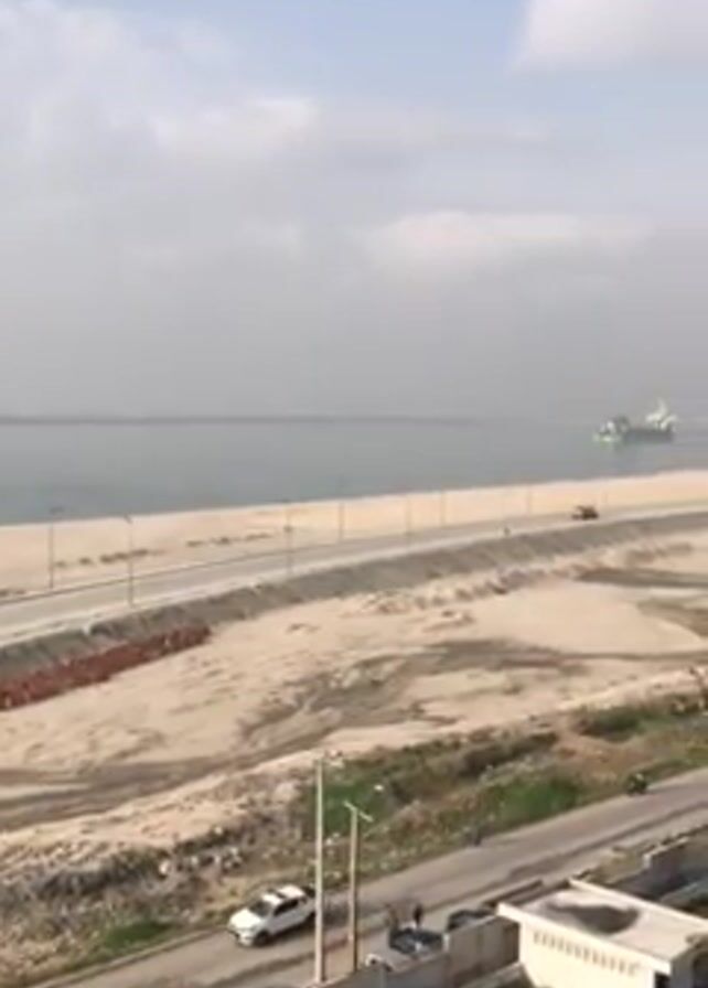n outdoor, slightly elevated view of a construction site alongside a body of water, likely a sea or large lake. A long stretch of sandy land separates a paved road with streetlights from the water. A large boat is visible on the water. Vehicles, including cars and motorcycles, move along the road. Adjacent to the road is a green area with walkways and playground equipment. A large building under construction dominates the right side of the frame, with a crane positioned near it. The sky is overcast.