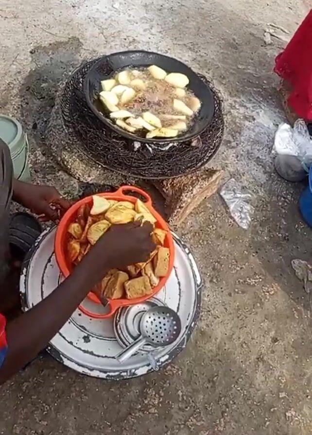 The scene is an outdoor cooking setup on what appears to be a concrete or similar rough surface. A person is sitting on the ground near the cooking area. To their left, there’s a green bucket. At the center, there’s a large white tray on which sits an orange colander filled with fried food items, some cut in the shape of apple slices and others appearing as square pieces. Next to the colander, on the tray, is a slotted spoon. Above this tray, there’s a frying pan with more of the apple-slice shaped food items frying in oil. The pan is placed on what looks like a wire grate, supported by stones, possibly serving as a makeshift stove. To the right of the pan, there are some plastic bags and another person in a red garment. The person on the ground is using their hands to sort through the food in the orange colander.
