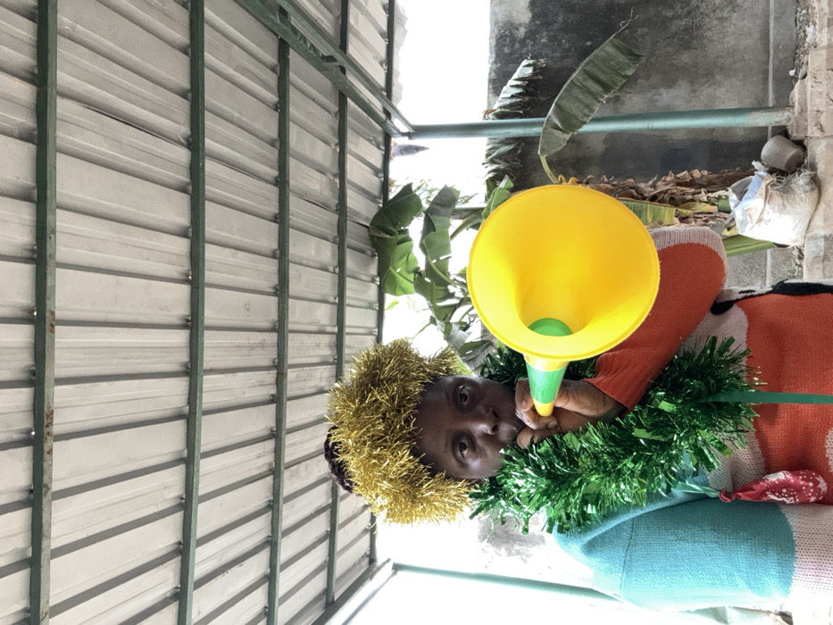 The image depicts an individual in Sabon Tasha, Nigeria, positioned outdoors under a corrugated metal roof structure. The central subject is an adult, appearing to be female, with dark skin, wearing a multi-colored long-sleeved sweater patterned in light blue, orange, and white/beige. She is adorned with a gold tinsel headpiece and a green tinsel garland around her neck, from which a small, deflated red balloon with white speckles is suspended. The individual is actively blowing into a bright yellow plastic party horn with a green mouthpiece, facing directly towards the viewer with a pursed mouth. In the background, a light-colored concrete or stucco wall is visible behind banana plants with large green leaves and some dried foliage. On the ground near the wall, a white sack, possibly containing granular material, rests next to a dark, indistinct object. The overhead structure consists of a corrugated metal roof, likely galvanized steel, supported by a green painted metal framework. The lighting suggests a bright, overcast, or shaded daytime environment.
