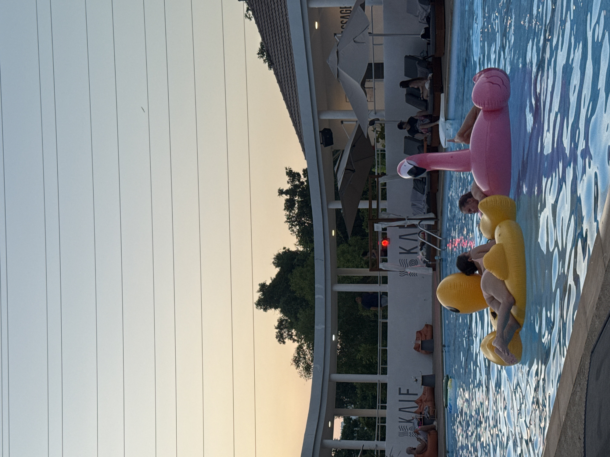 This image depicts an outdoor swimming pool area at dusk, located in Kathu, Thailand, identifiable by the "KAIF" branding visible on a white wall. The sky transitions from light blue at the top to an orange-yellow hue towards the horizon, where dark green trees are visible. Multiple overhead power lines cross the upper portion of the frame. In the foreground, a large swimming pool with blue water is occupied by several individuals. Two people are prominently positioned on large inflatable floats: one individual is lying prone on a yellow inflatable duck, partially submerged, with their legs and back visible. Another individual is lying supine on a pink inflatable flamingo, with their legs and one arm visible. A third person's head is visible in the water between the two floats. Further back in the pool, a blue and green inflatable ring is also present. The pool is bordered by a white wall displaying the dark "KAIF" logo. Along the pool's edge, multiple white lounge chairs with dark cushions are arranged, some occupied by individuals. On the left, orange beanbag chairs are visible, with one person seated on them. Behind the pool, a multi-level white building with a curved, open-air upper deck supported by white pillars is present. A person in a dark shirt is standing on this upper deck. To the right, a building section with a brown tiled roof features two large, cream-colored patio umbrellas. Signs displaying "KAIF" and "SSAGE" (part of a larger word, likely "MASSAGE") are affixed to the white walls of the structures. A dark speaker is mounted on a wall, and red decorative lighting is visible. Several other individuals are seated or standing in various areas around the pool and structures, engaging in leisure activities.