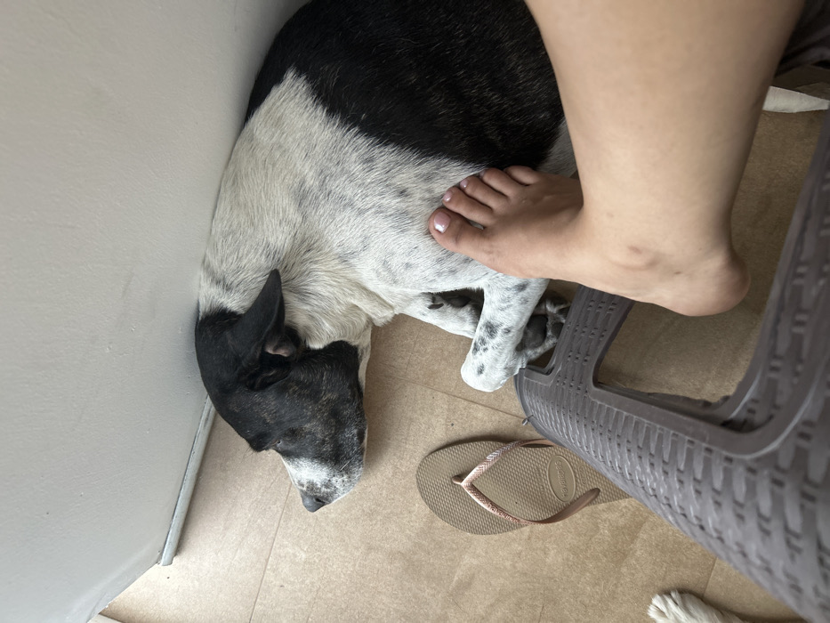 A black and white dog lies curled against a white wall. The dog is mostly white with black spots, and its head is black. A bare human foot rests on the dog's back. Next to the dog is a brown flip-flop and part of a gray plastic chair. The floor is beige tile.