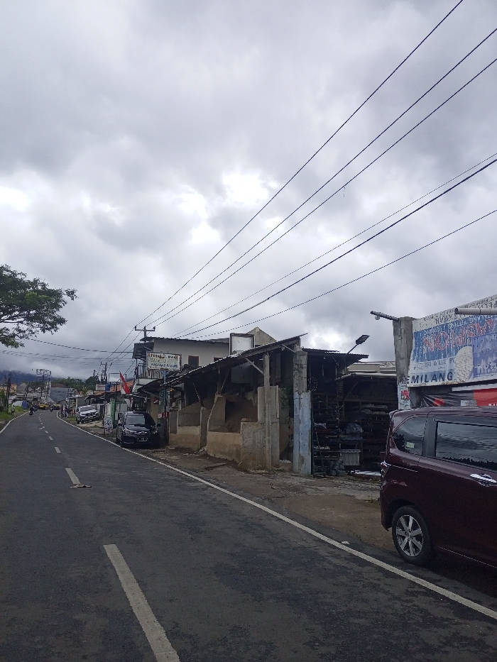 An overcast day captures a street scene with power lines overhead. On the right, a maroon minivan is parked beside a series of rundown buildings, one displaying a large advertisement. The street stretches into the distance with a few vehicles parked along the side. The sky is filled with heavy, grey clouds.