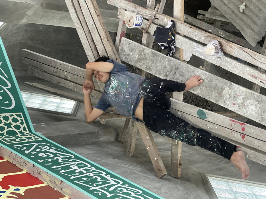 The image depicts a male individual resting on a wooden scaffolding platform within a building under construction or renovation in Kumbang, Indonesia. The man lies supine with his arms folded over his head and face, appearing to be asleep or resting. He is barefoot, wearing a blue t-shirt and black track pants, both extensively splattered with multi-colored paint (primarily white, green, and red). The environment consists of unfinished concrete walls. To the left, a painted section of a wall features a prominent green band with white Arabic calligraphy and white geometric star patterns, bordered by a red section with yellow designs. In the background, a window composed of frosted glass blocks is visible within the unpainted concrete. The scaffolding is constructed from rough wooden planks and beams, also marked with paint splatters. Adjacent to the man on the scaffolding, a white plastic bucket containing paint or brushes, a folded black garment or cap, and a clear plastic bag with what appear to be paintbrushes are present. The floor beneath the scaffolding is a rough, unrefined surface.