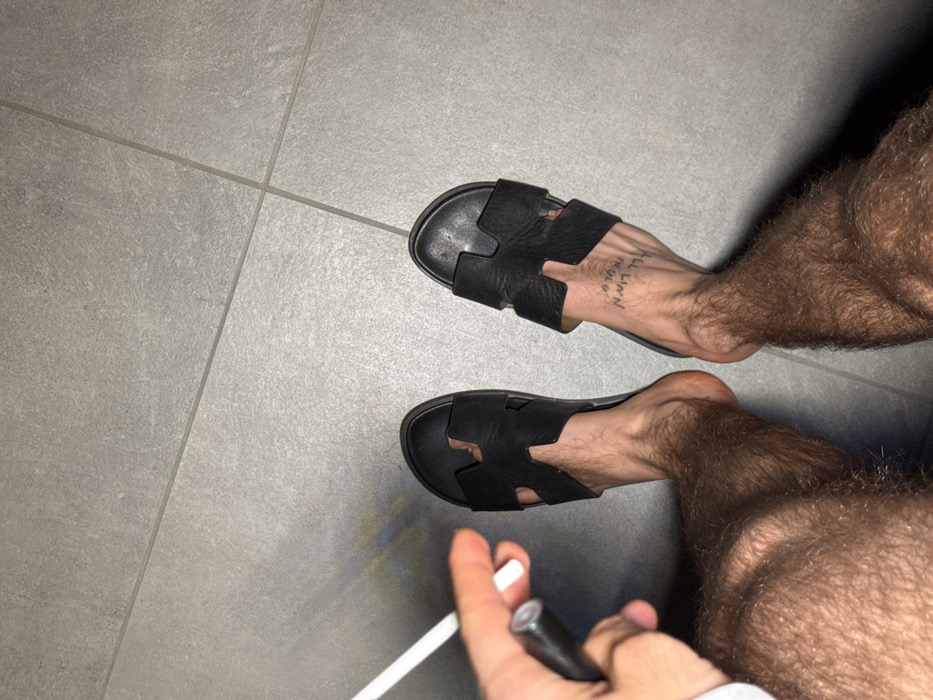 The image depicts a top-down view of a person's lower legs and feet on a light grey tiled floor in Chambœuf, France. The person's notably hairy legs extend towards the bottom of the frame. Both feet are bare and inserted into black, H-strap style open-toed sandals. A black ink tattoo with legible text, possibly "ILL LINN THU U," is present on the top of the right foot. A left hand is visible on the left side of the frame, holding a white cylindrical object, resembling a cigarette or vape pen, alongside a black cylindrical object, possibly a lighter or another component of a vape device. The tiled floor features visible grout lines. A subtle, diagonal band of refracted light exhibiting rainbow colors is present on the floor to the left of the feet. Shadows are cast by the legs and sandals on the floor.