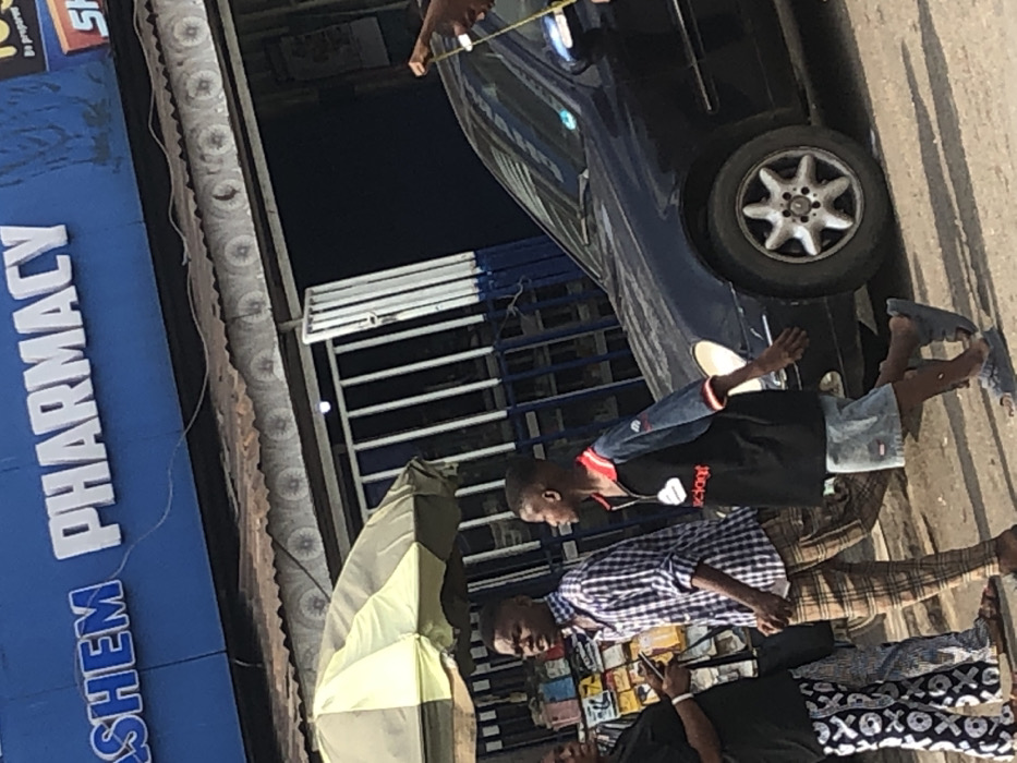 The image displays an outdoor street scene in Owerri, Nigeria, under bright daylight