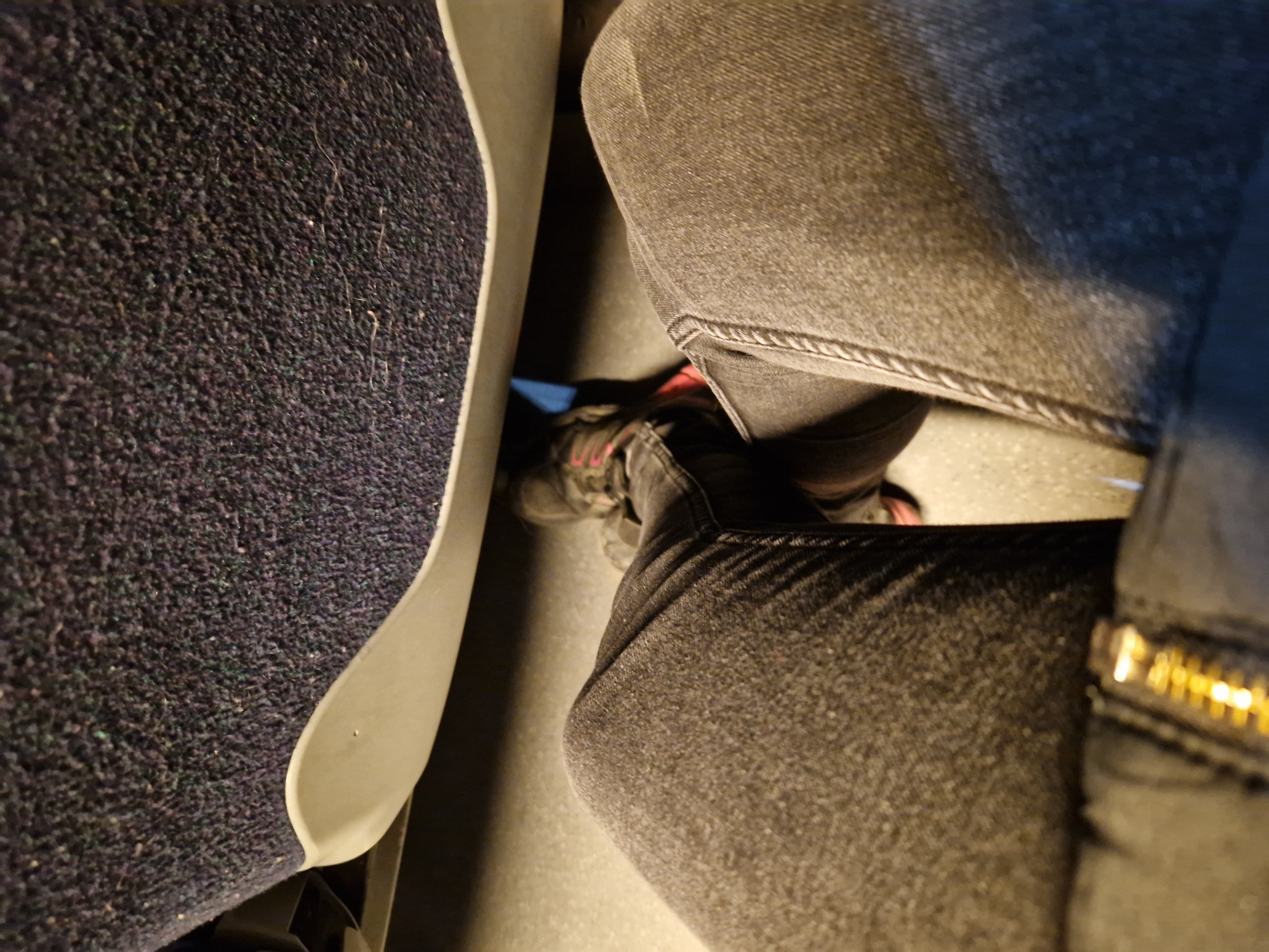 - "This image shows a first-person view of a person sitting on a bus or train, wearing gray jeans and black and gray running shoes with red accents" by FM-JBLtz2, licensed under CC BY 4.0