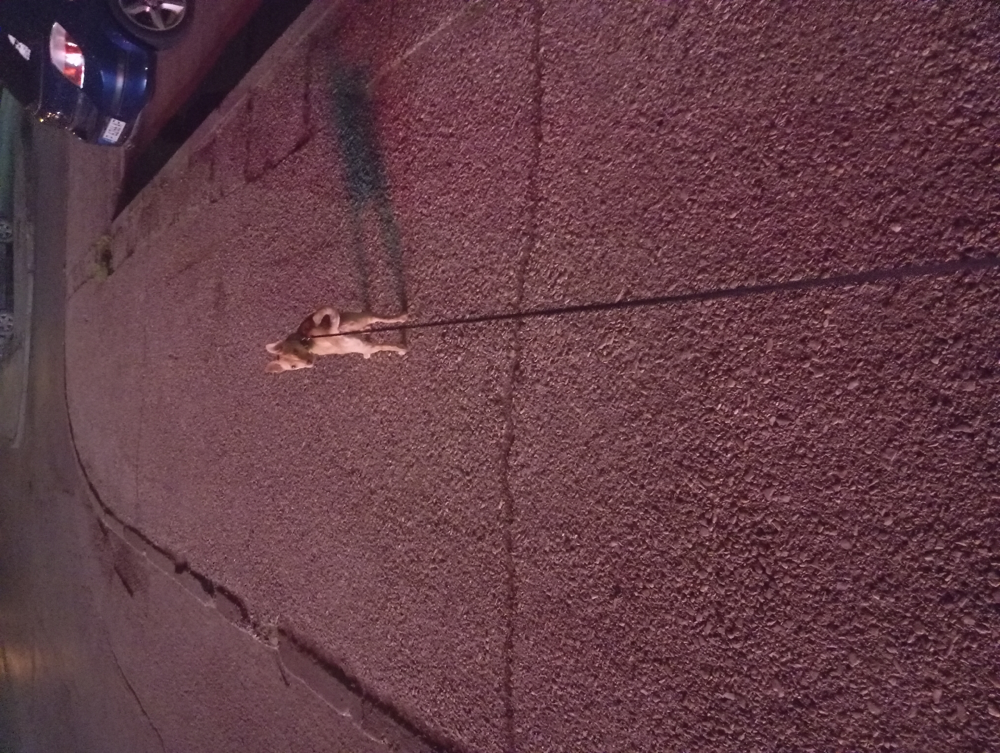 dog on a leash walking on a paved road in an urban setting. The dog is light-colored and the leash extends away from it. A vehicle, likely a car, is parked along the curb at the edge of the road. The pavement has a rough texture, and there is a shadow visible on the road surface.