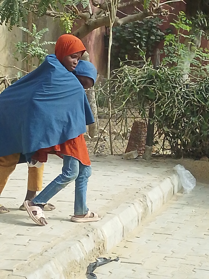 In Babban Giji, Nigeria, two individuals are present on a paved outdoor surface. One person, positioned to the left and facing partially right, wears an orange head covering and an orange upper garment under a blue wrap-like cloth that covers their back and shoulders. This individual appears to be carrying another person on their back, whose head and upper body are largely obscured by the blue cloth; a blue head covering is visible on the carried person. The person carrying wears blue jeans and light-colored open-toed sandals. Their left leg is extended forward, suggesting movement. A third pair of legs, wearing light-colored pants and sandals, is partially visible on the far left, suggesting another individual walking alongside or slightly behind. The ground consists of light-colored interlocking pavers. A concrete curb runs horizontally across the mid-ground. To the right of the curb, the ground also appears paved. A crumpled clear plastic bag is visible on the paved surface to the right of the curb. The background features light brown and reddish-brown wall structures, partially obscured by green leafy vegetation and tree branches. A dark brown woven object, possibly a basket or container, stands upright near the vegetation on the right side of the image. The lighting suggests daylight conditions, casting minimal shadows.
