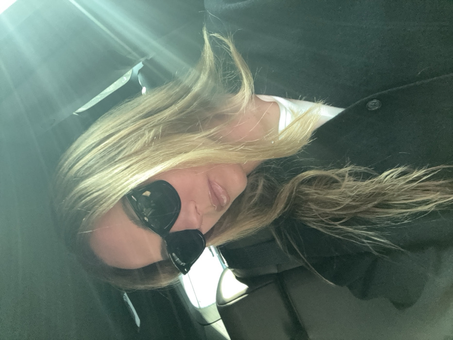 A woman with blonde hair sits inside a car wearing dark sunglasses