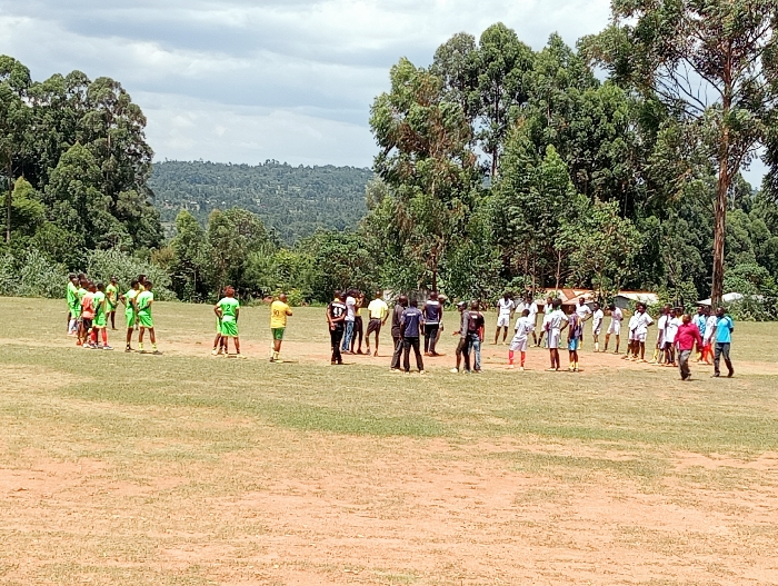 The scene depicts an outdoor sports field in Lumakanda ward, Kenya, under a partly cloudy sky