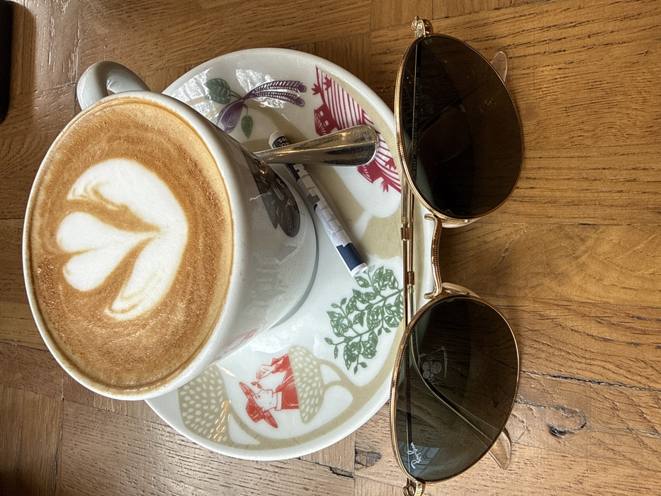 - "The image displays a close-up, overhead view of items arranged on a light brown wooden table, indicative of a cafe setting in Burgas, Bulgaria" by FM-GT2u92, licensed under CC BY 4.0